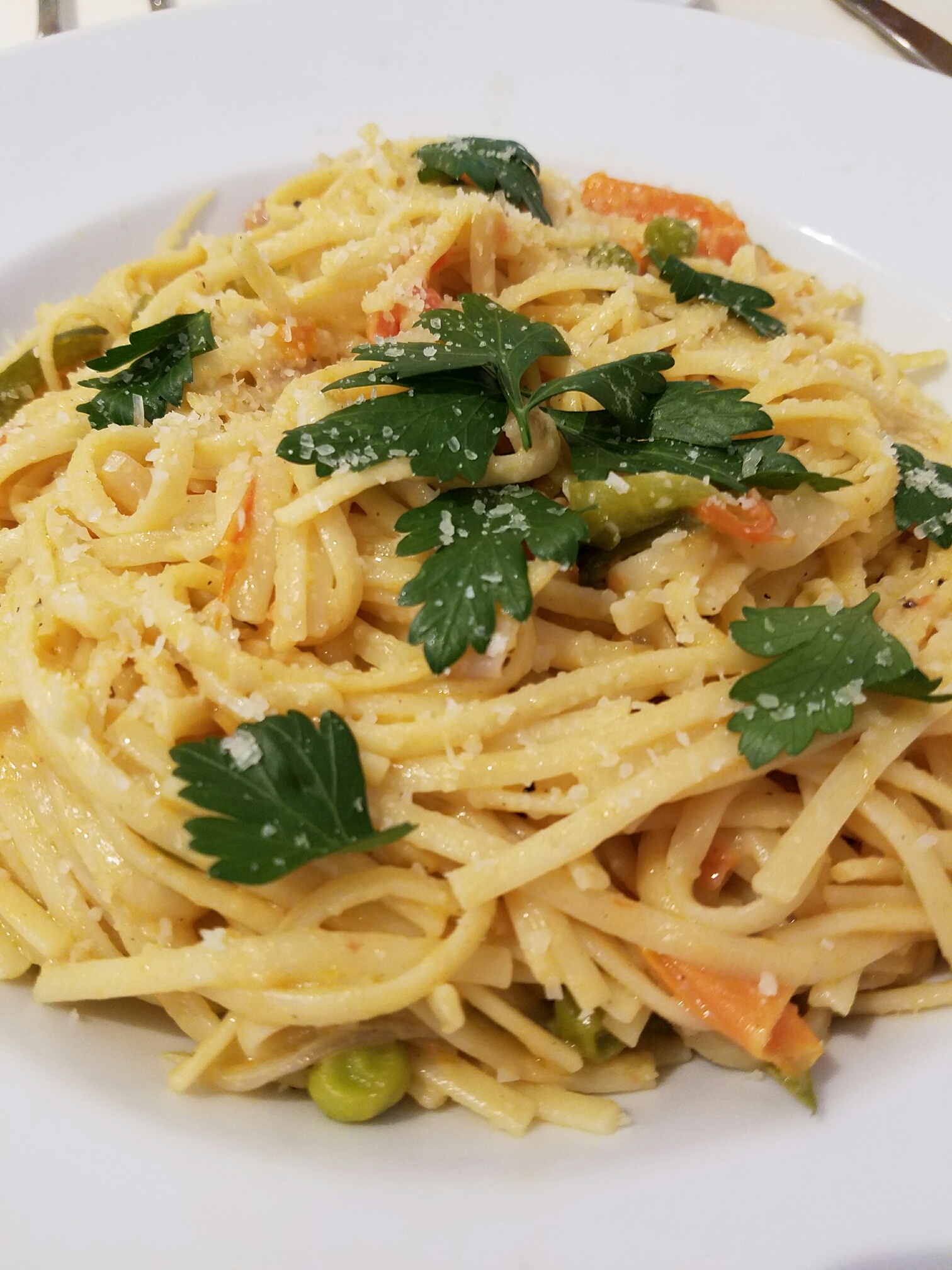 With the guidance of Chef Miya, Chef de Cuisine James Aung, Sous Chef Takeshi Kuriyama, and Kitchen Manager Jason Hicks, the students prepared a four-course lunch for themselves and their teachers. They made a Frisee Salad with Anchovy and Caper Dressing, Roasted Chicken with Fingerling Potatoes and Gravy, Pasta with Cream Sauce, Peas, and Carrots, and Puff Pastry with an Apple Cranberry Compote.